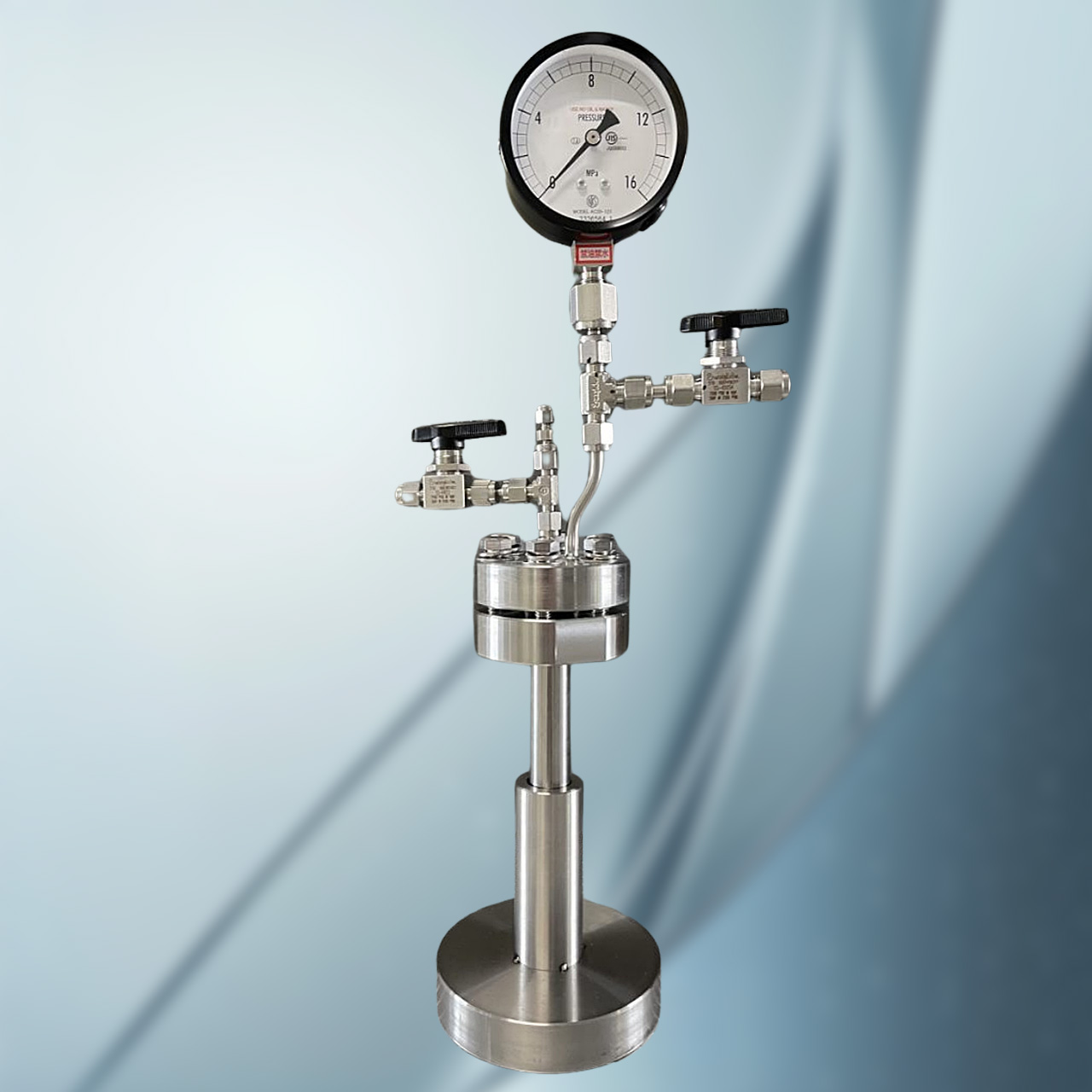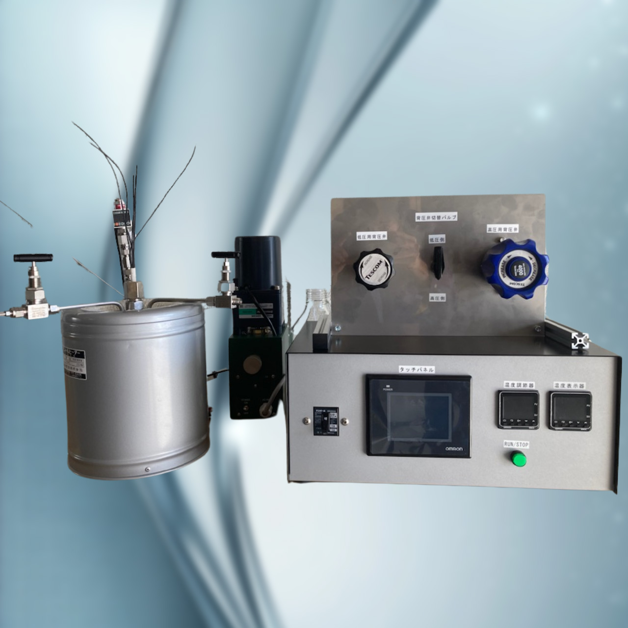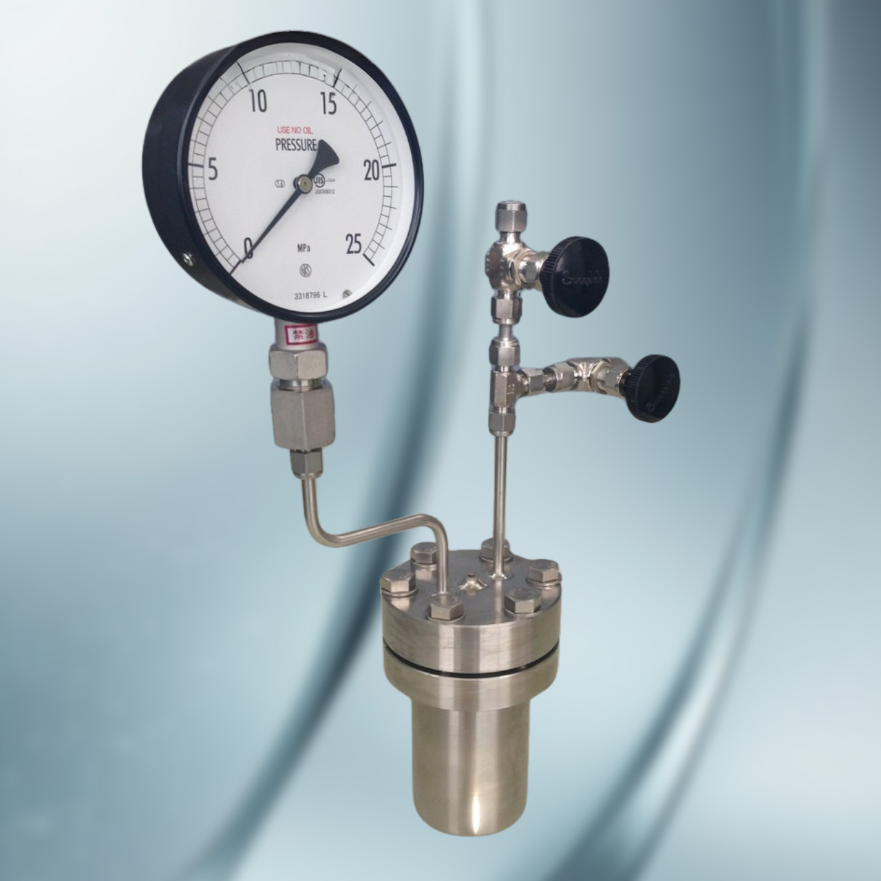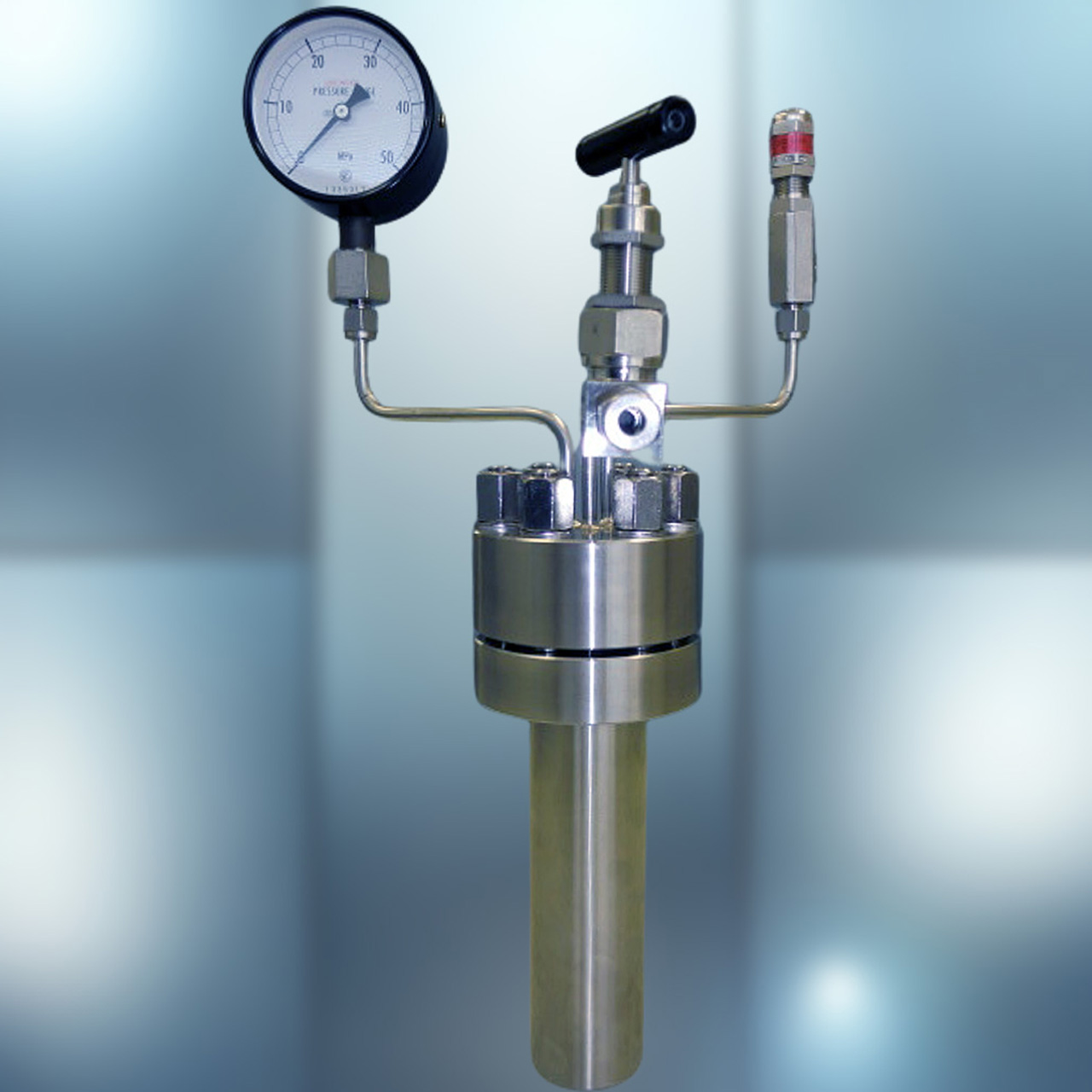 75 cc の極小容器で 30 MPa/500 ℃ に対応。PI 計付きで圧力管理が容易、SFV(安全弁)装備で過昇圧を自動逃がし