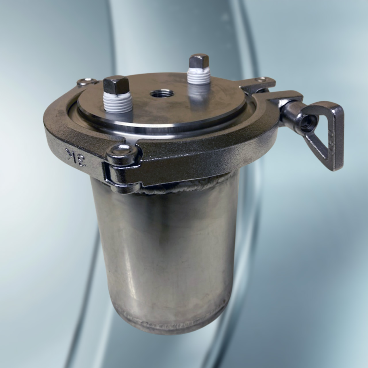 600 cc/0.5 MPaの細長 SUS304 溶接容器。全周 TIG 溶接で高温リークレス運転