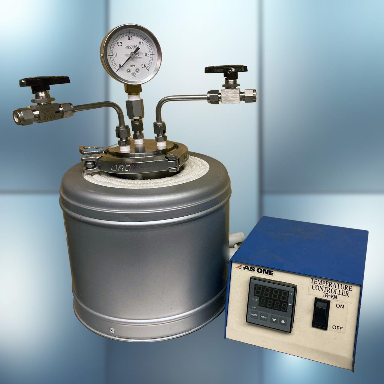 自動開放安全弁を標準装備し、加圧・昇温はセンサーで常時モニタリング。耐食合金ボディが漏えいを防ぎ、ドラフト内に置くだけで 30 MPa・500 ℃クラスの高温高圧実験を安定かつ再現良く行えます。