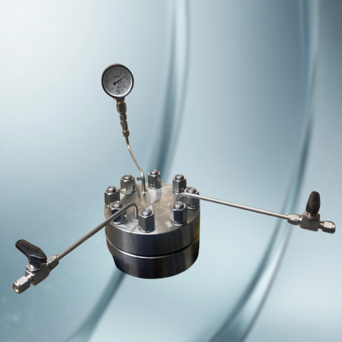 シリコンウェーハ高圧容器 ○ 内容積: 15ml○ 圧力: 6MPa○ 使用最高温度: 500℃○ オプション: バルブ・圧力計○ ポイント:φ80のシリコンウェーハを入れて実験したいと言うご要望から出来ました。 取り出しやすさを考えて底の形状が複雑になってます